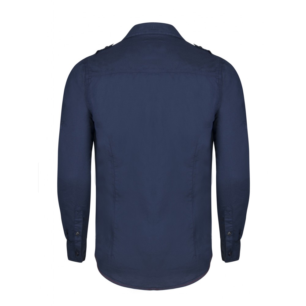 Lahka srajca iz mešanice bombaža in lanu z dolgimi rokavi, klasičnim ovratnikom in zapenjanjem na gumbe. Na prsih dva žepa.